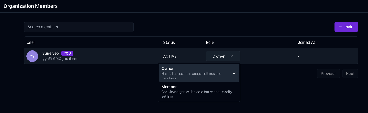 - Invite Team Members: Admin users can invite teammates via email through the Member Management page. Team members must register using the exact email address they were invited with. After registration, they must accept the invite to join the organization and project.